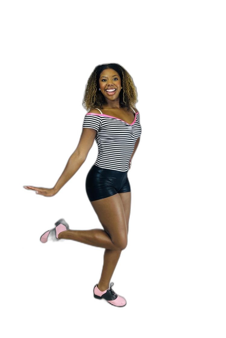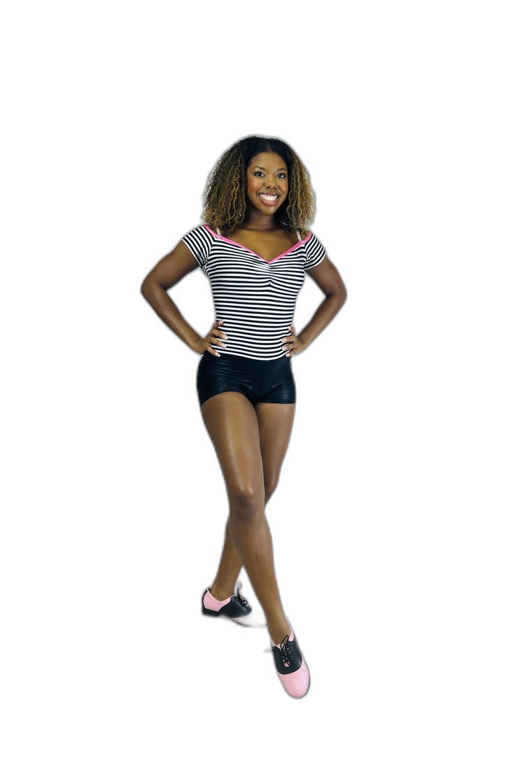 Command the stage with this bold and stylish off-the-shoulder biketard, designed for dancers who love to make a statement. Featuring classic black and white stripes paired with sleek black shorts, this one-piece costume is ideal for jazz, musical theatre, or character pieces with a flirty Parisian flair or a modern “Jailhouse Rock” vibe.