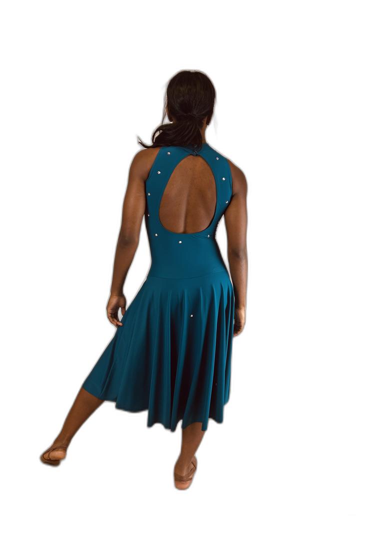 This long lyrical halter dress in teal by DanzGear is built on a leotard for secure fit and easy movement. It features a large keyhole back and sparkling rhinestone details for added stage shine. Model wears a size small.