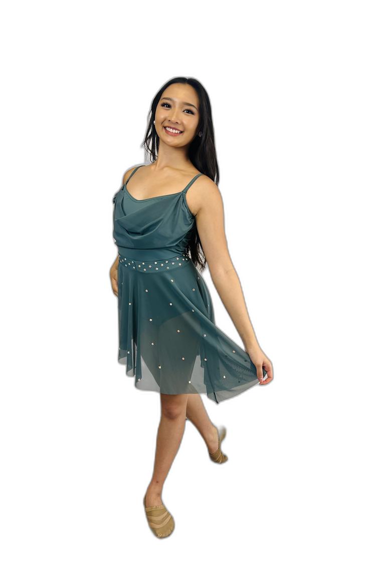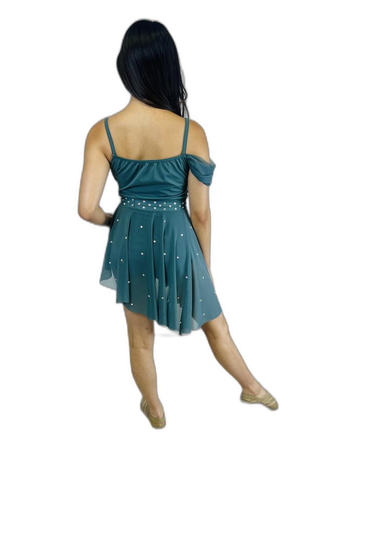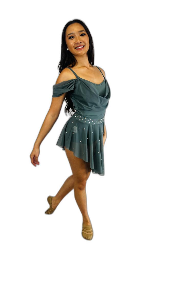Graceful and stage-ready, this sage green camisole leotard features an attached draped chiffon scarf for fluid movement and visual impact. Paired with a rhinestone-embellished asymmetrical chiffon skirt, this costume by Kelle Company is perfect for lyrical, contemporary, and solo dance performances. Designed to flatter and flow with every motion, it’s a favorite among dance teachers seeking cohesive recital looks with a touch of sparkle. Shown in size medium.