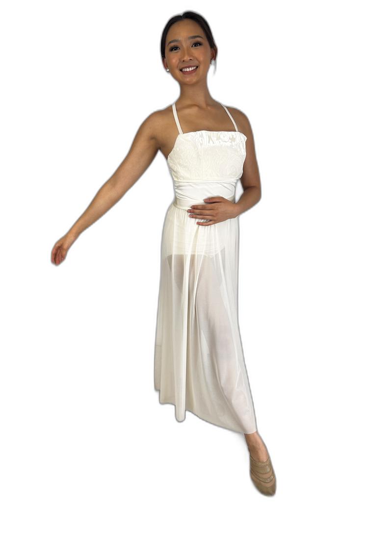 Designed by Kelle, this camisole leotard features a velvet-embossed top and crisscross back straps, paired with a flowing chiffon skirt—perfect for lyrical and contemporary routines. Model is wearing a small.