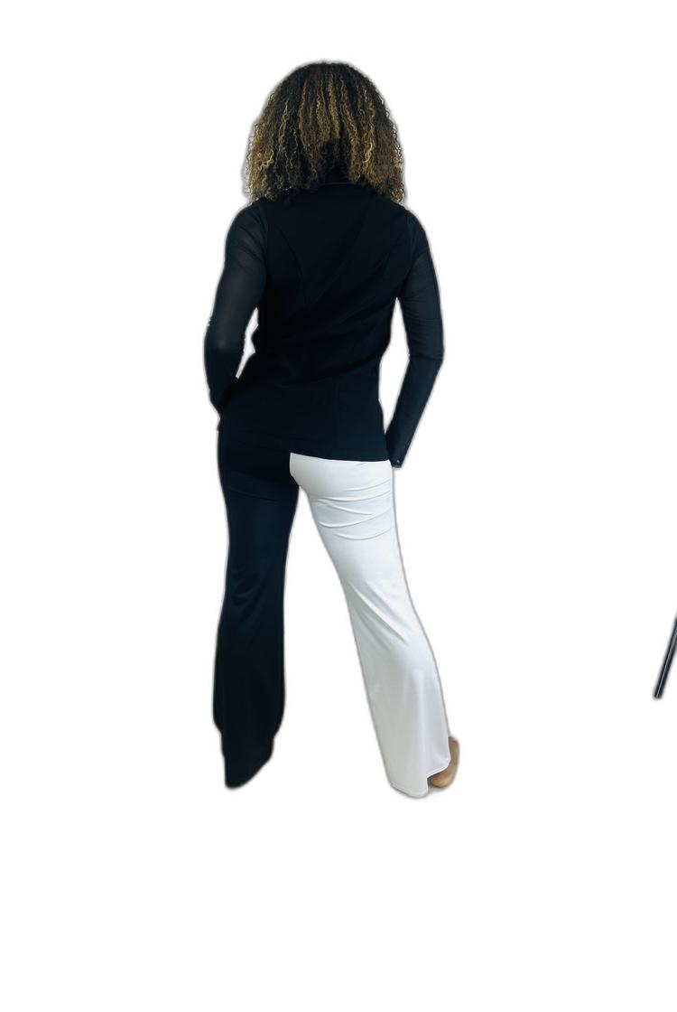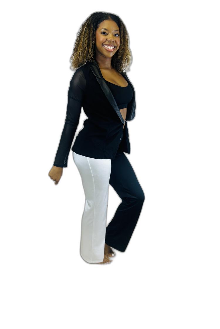These striking dance pants, designed by Kelle, feature one black leg and one white leg for a bold, eye-catching look. The model is wearing a size small, paired with the TJC30 black jacket, which is sold separately.