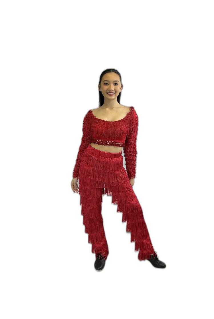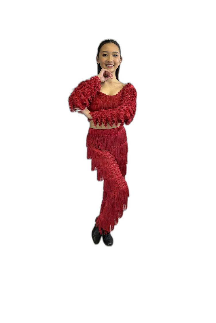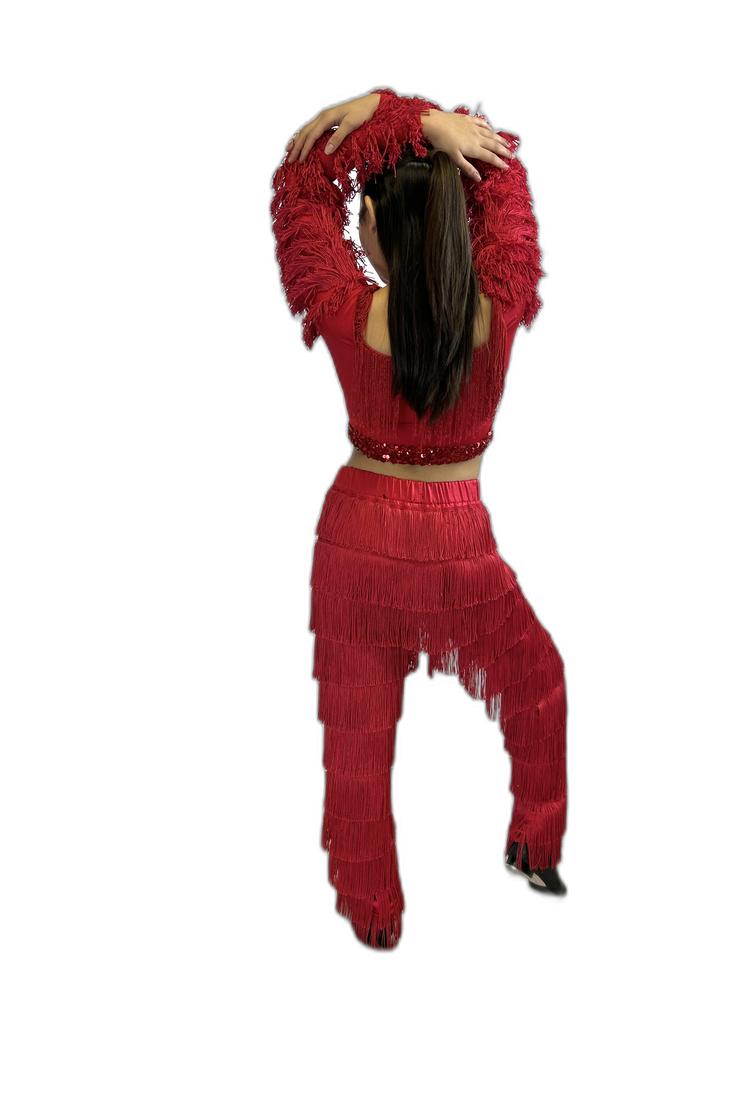 - – Bright red fringe long-sleeved crop top with matching fringe dance pants