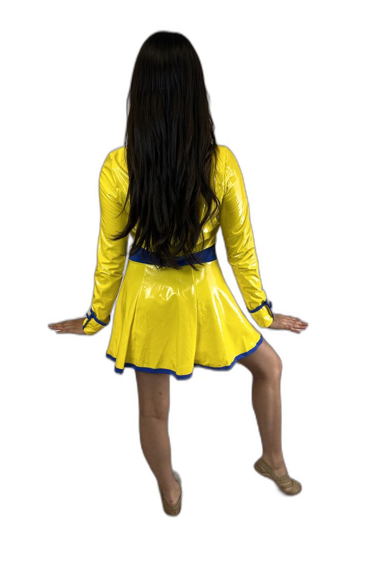 Created by Weissman, this cheerful yellow raincoat-inspired dress with blue trim and a matching belt evokes the charm of Singing in the Rain. Trunks and umbrella not included. The model is wearing a size small.