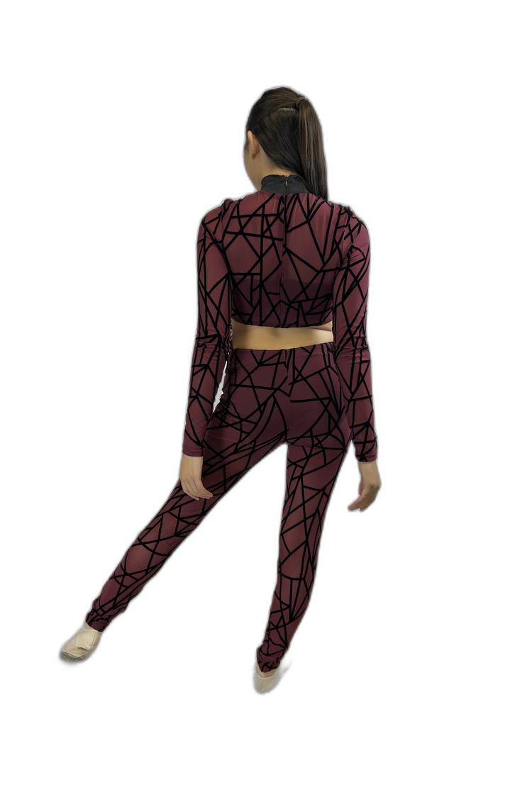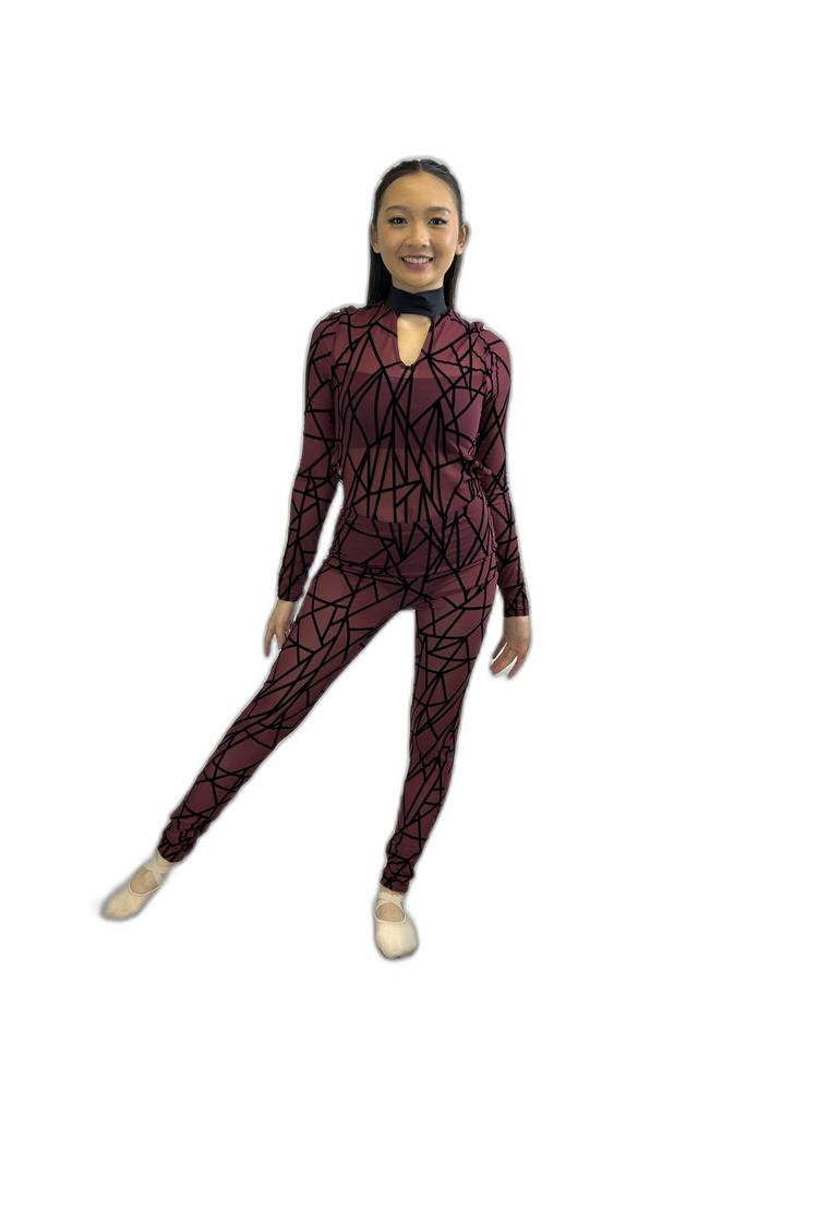 Sheer Burgundy Graphic Unitard, designed by Weissman, features an attached bra top and briefs, long sleeves, a mock turtleneck, and a keyhole neckline. Accented with a bold black Spiderman-style graphic and an open-back midriff, it combines striking style with sleek sophistication. The model is wearing a medium.