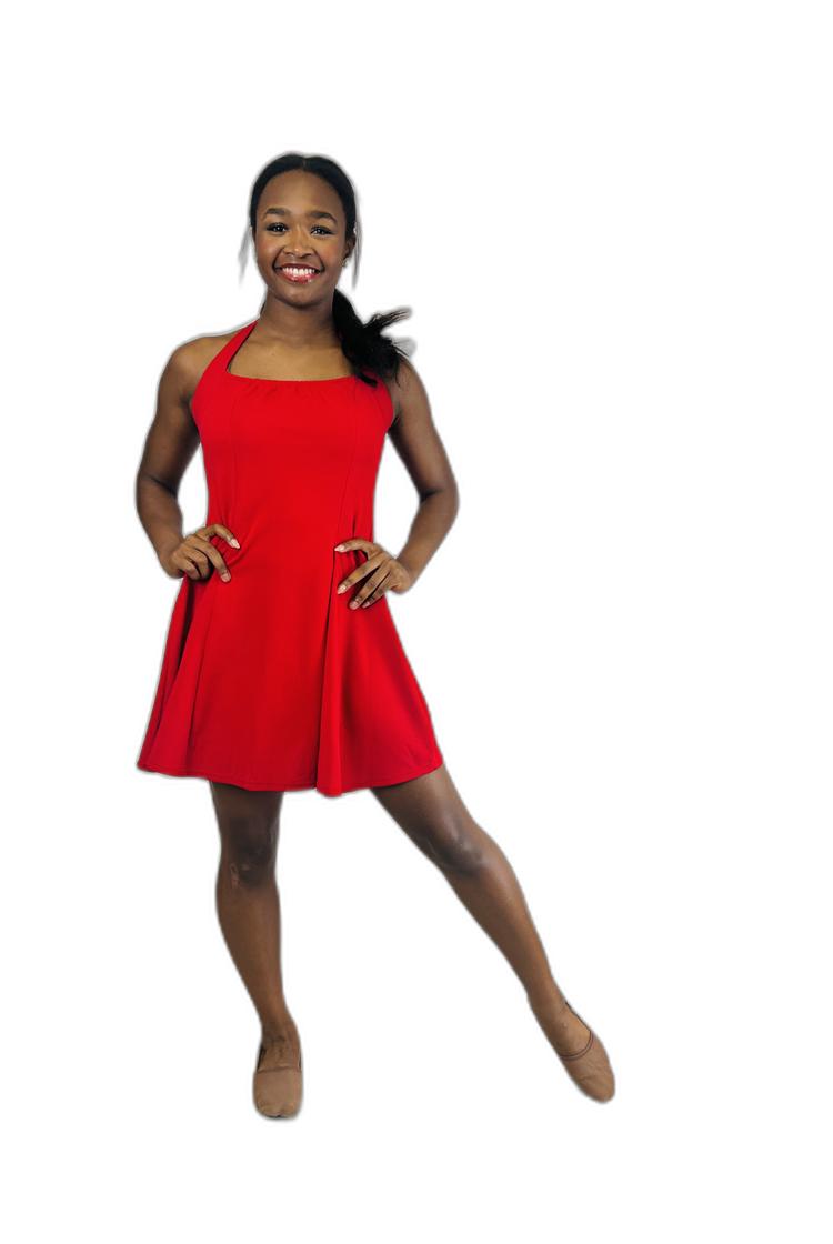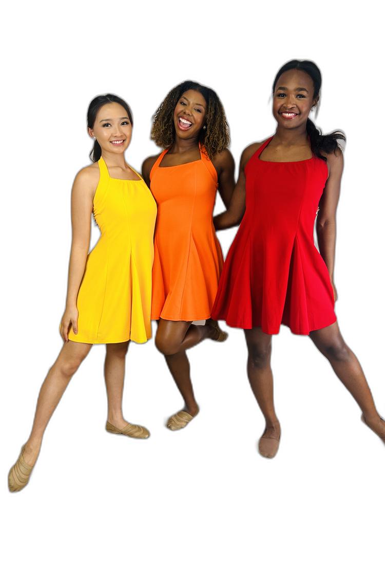 - – Vibrant halter dress in bold red, yellow, and orange hues with a playful short circle skirt
