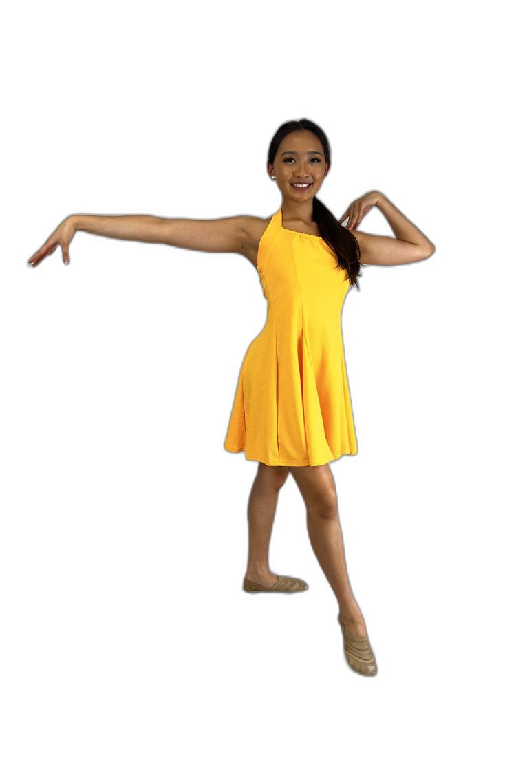 A vibrant halter dress in striking red, yellow, and orange features a playful short circle skirt. It does not include dance shorts, and the tie at the neck has a stylish rough-cut finish. Designed by Shein.
