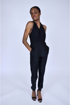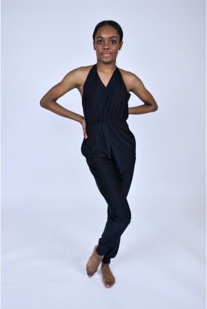 SIMPLE, YET SOPHISTICATED BLACK LYCRA JUMPSUIT TIES AT THE NECK AND HAS AN OPEN BACK. DESIGNED BY SPARKLE.