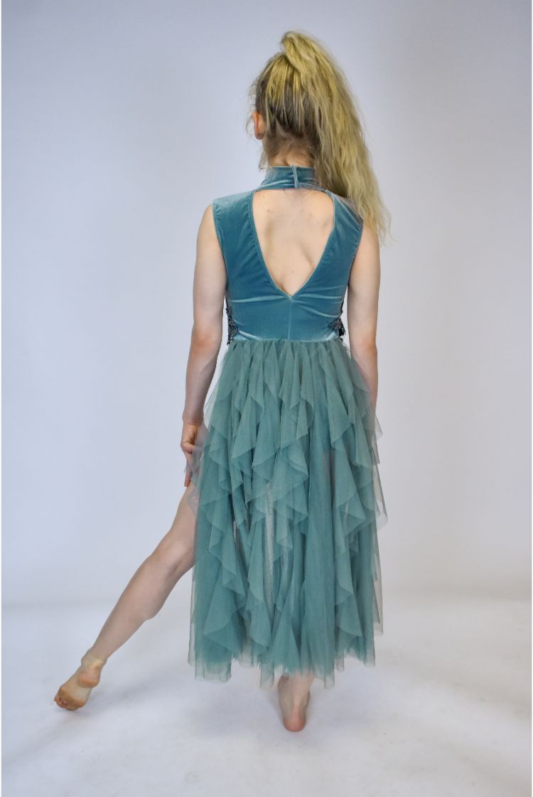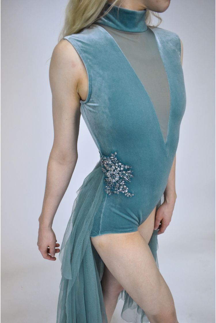 This sage green velvet leotard by Weissman features silver and green floral sequin appliqués and a long ruffled bustle skirt for elegant movement. The vintage-cut design includes an open back and a snap mock turtleneck for a secure fit. Perfect for lyrical or contemporary routines. Model wears a medium.