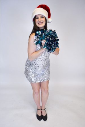 SILVER STRETCH SEQUIN HALTER STYLE MINI-DRESS WITH VELCRO CLOSURE AND WHITE SHEER NETTING ON THE CHEST HAS AN OPEN BACK AND INCLUDES WHITE DANCE SHORTS. DESIGNED BY SPARKLE. OUR MODEL IS WEARING A MEDIUM.