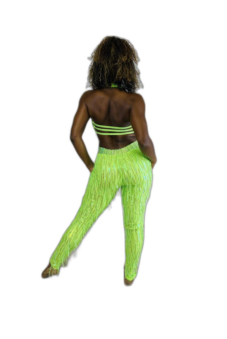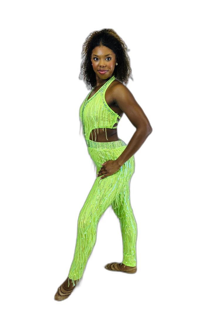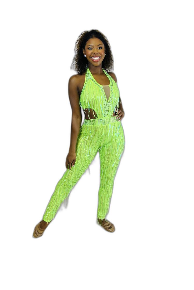 This lime green unitard, featuring long fringe and stylish side cut-outs, is designed by Glamour. The model is wearing a size medium.