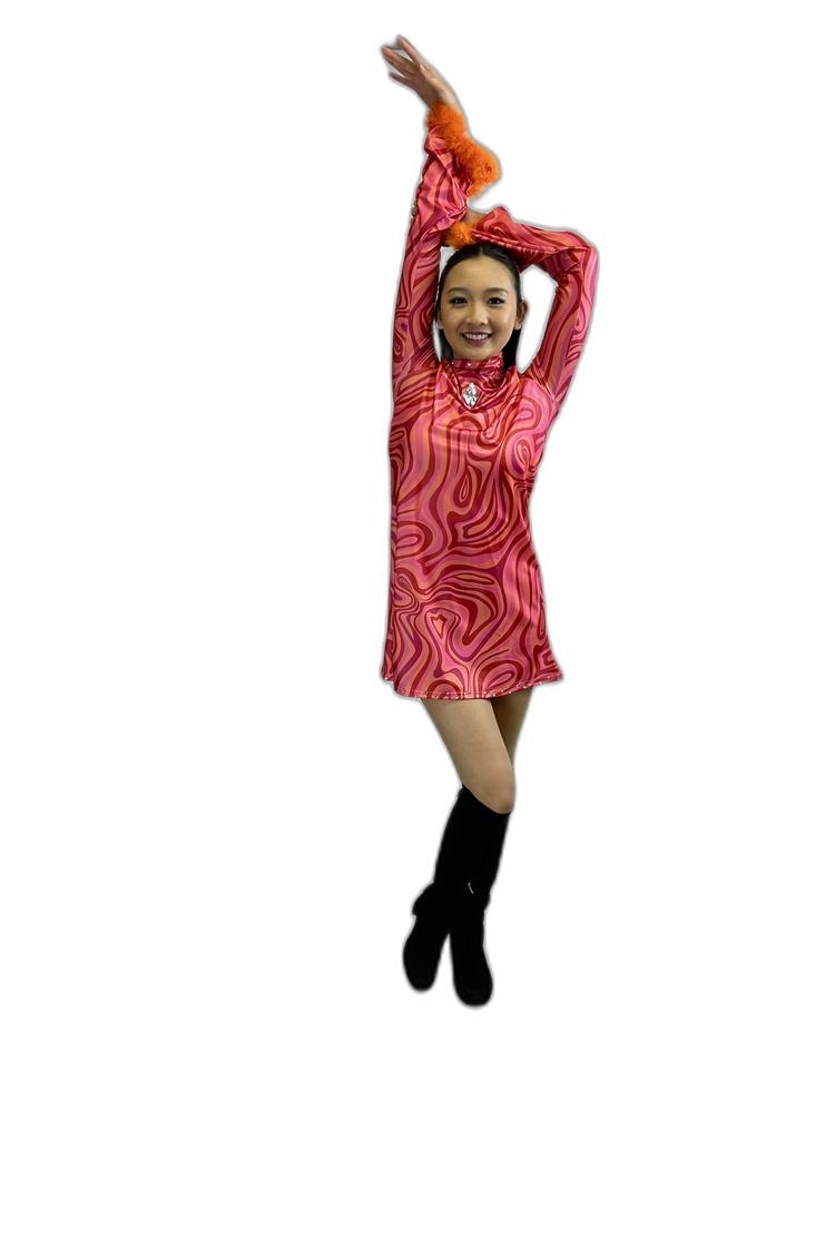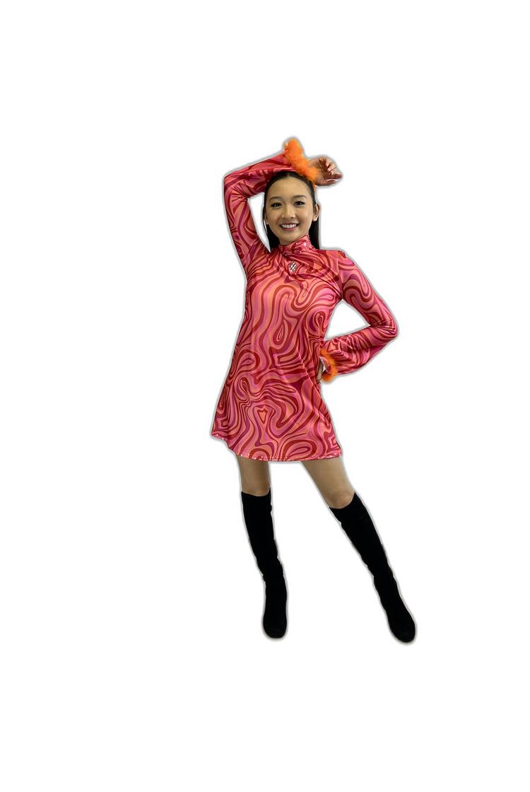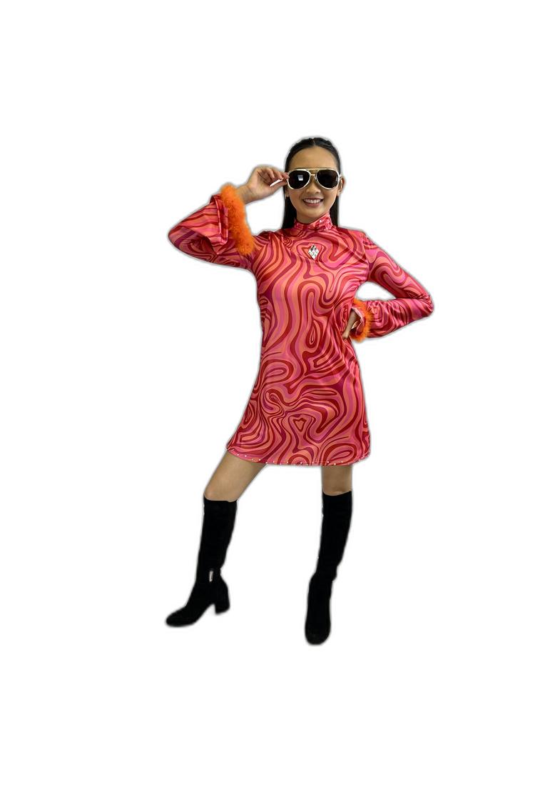 This striking 60’s-inspired dress in bright shades of bold orange and pink, features fun fur-cuffed sleeves that add a touch of retro charm. Designed by Weissman, the leotard base ensures both comfort and complete coverage. The model is wearing a medium size, and the costume may also come with a coordinating hair accessory for a polished finish.