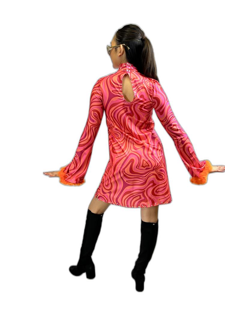 • – Vibrant 60’s-inspired dress in bold orange and pink