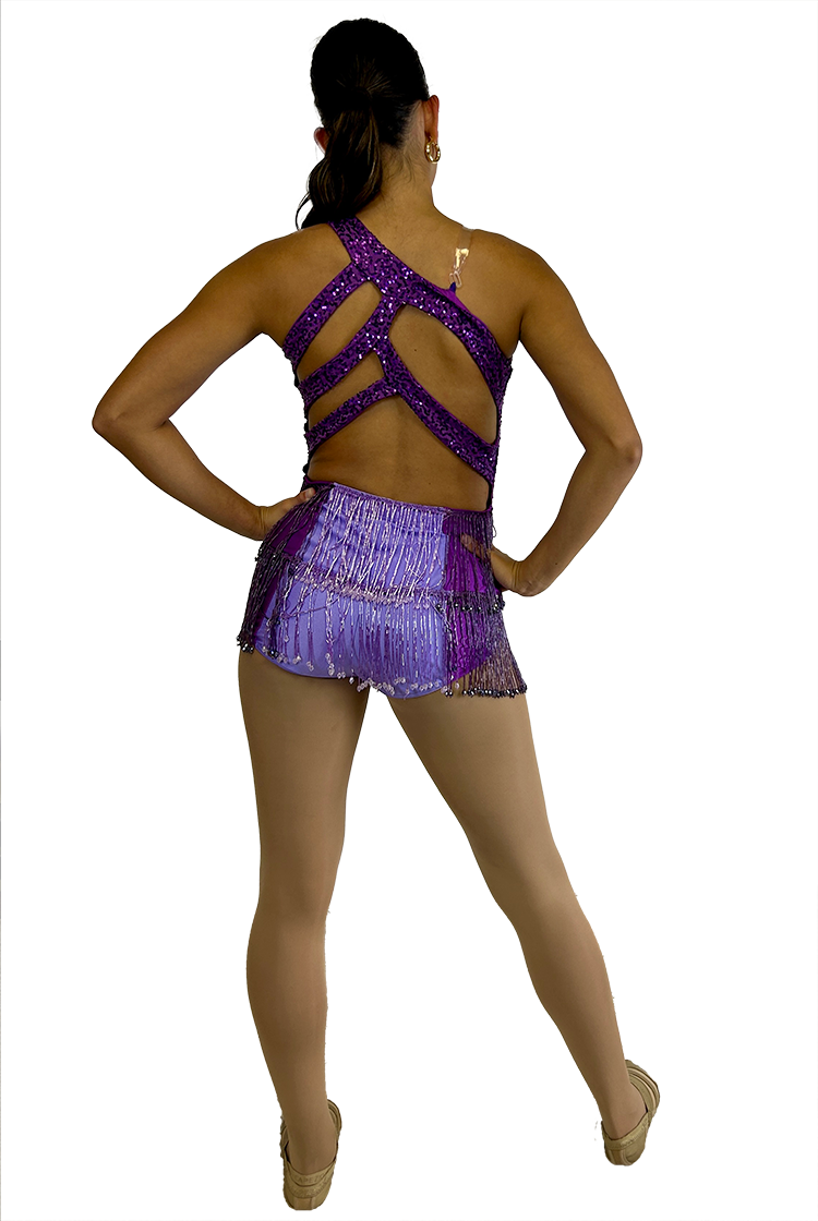 This stunning two-tone purple, one-shoulder leotard features a beaded fringe skirt, sparkling rhinestone accents, and an elegant strappy back. Designed by Sparkle, it’s modeled here in a size medium.
